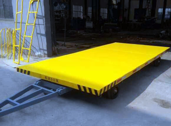 平板拖车配置万向联接器,转向灵活,操作方便;采用充气胎,在保证承载能力的同时,加快拖车在路上的行驶速度。